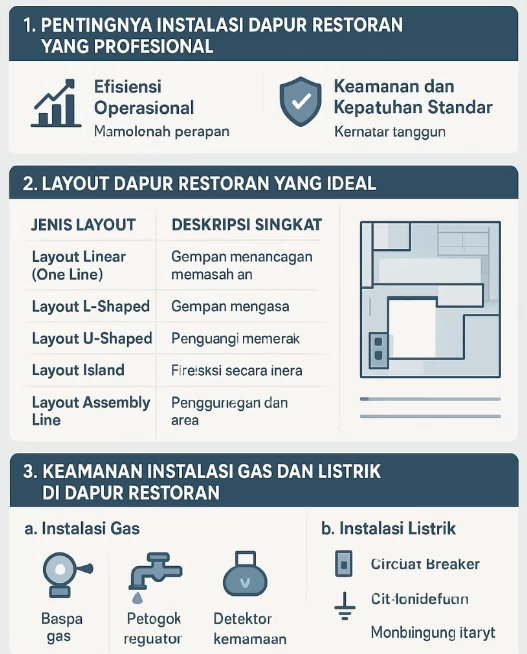 Aspek paling krusial dalam instalasi dapur restoran adalah keamanan sistem gas dan listrik. Berikut panduan yang perlu diperhatikan: